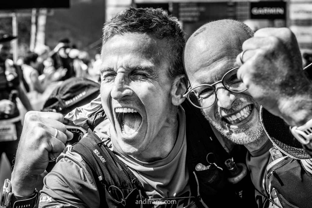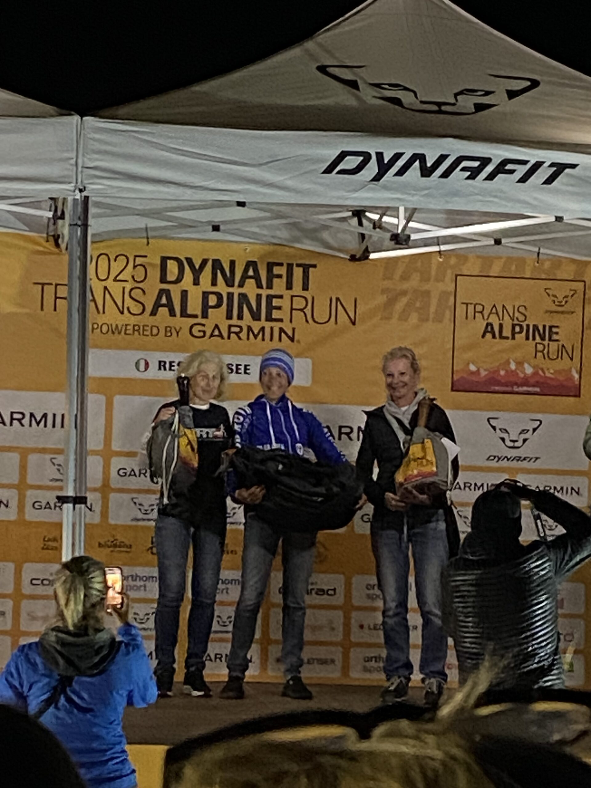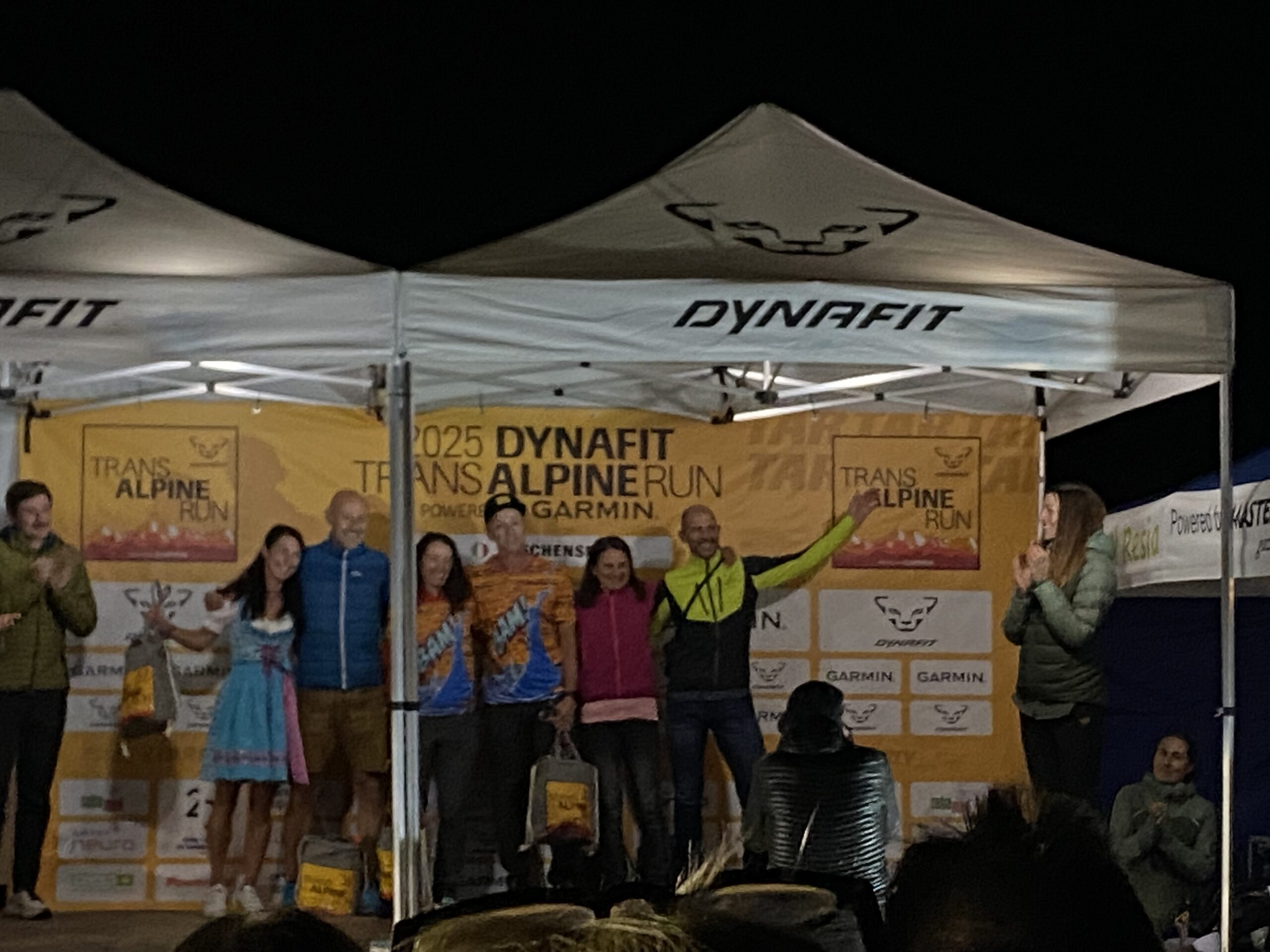 Team HBG kam als Tagesdritte ins Ziel und durfte direkt zur Siegerehrung aufs Podium . Doris kam als Tagezweite rein und Stoppi als 17ter. Nach 230 km und 14000 HM war die Stimmung bestens und endlich konnte man auch mal mit einem richtigen Bier anstoßen. Was die TVRler in einer Woche erleben ist sowas wie „fast living“. Am Abend wurde Doris auch als dritte in ihrer Kategorie geehrt, einfach nur phänomenal. Mit 33:41 Stunden wurden die HBG gesamt vierter in ihrer Kategorie und Stoppi freute sich mit 37:01 über seinen 18ten Platz. Es wurde angestoßen, getanzt und auch mit Rosanna Buchauer (momentan beste deutsche Trail Läuferin) posiert und gefachsimpelt.