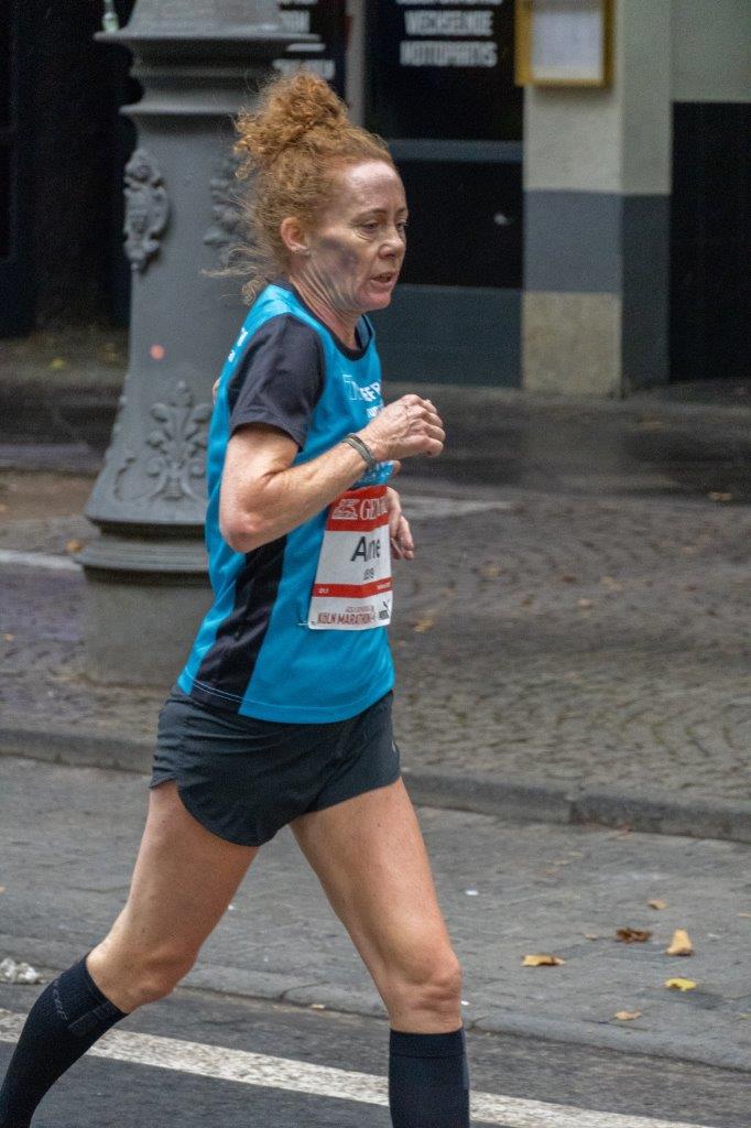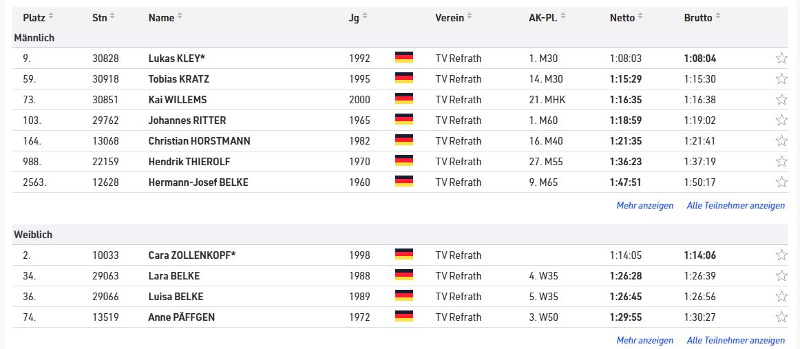 Auch alle weiteren Ergebnisse der TVR-Halbmarathonis können sich sehen lassen: Tobias Kratz (14.M30) war nach seinem Infekt mit 1:15:29 std genau so zufrieden, wie Kai Willems (21.M20), der sich auf starke 1:16:35 std verbesserte. Als Deutsche M60 Meister gewann Johannes Ritter im April in Paderborn noch in 1:22:00 std den DM-Titel. Nun steigerte der Kölner (er lief an seiner Haustüre vorbei) im TVR-Trikot seine eigene AK-Jahresbestzeit auf starke 1:18:59 std. Bei den TVR-Damen freuten sich die Schwestern Lara (4.W35/1:26:28) und Luisa Belke (5.W35/1:26:45)) über ihren gelungenen Leistungstest für Frankfurt Marathon in drei Wochen. Auf dem Treppchen als Dritte der AK W50 mit einer Punktlandung wie im Vorjahr von 1:29:55 min stand Anne Päffgen. Christian Horstmann (16.M40) bleib mit 1:21:35 std nur drei Sekunden über seine PB. Über einen neuen Hausrekord freute sich Hendrik Thierolf ganz besonders. Er verbesserte sich um fast vier Minuten auf 1:36:23 std. Hermann Belke (1:47:51) finishte als Neunter der M65.Über eine neue persönliche Bestmarke freute sich auch Peter Franken. Er war im blauen Trikot seines Arbeitgebers auf den Kölner Straßen unterwegs. In der Ergebnisliste der Polizei Köln steht der M35-Läufer mit 1:21:43 std auf Platz eins!