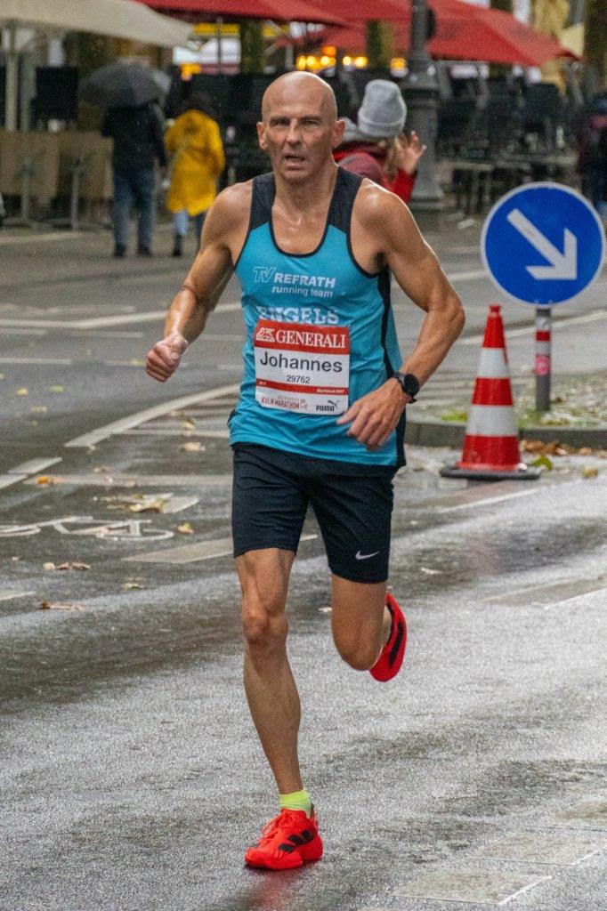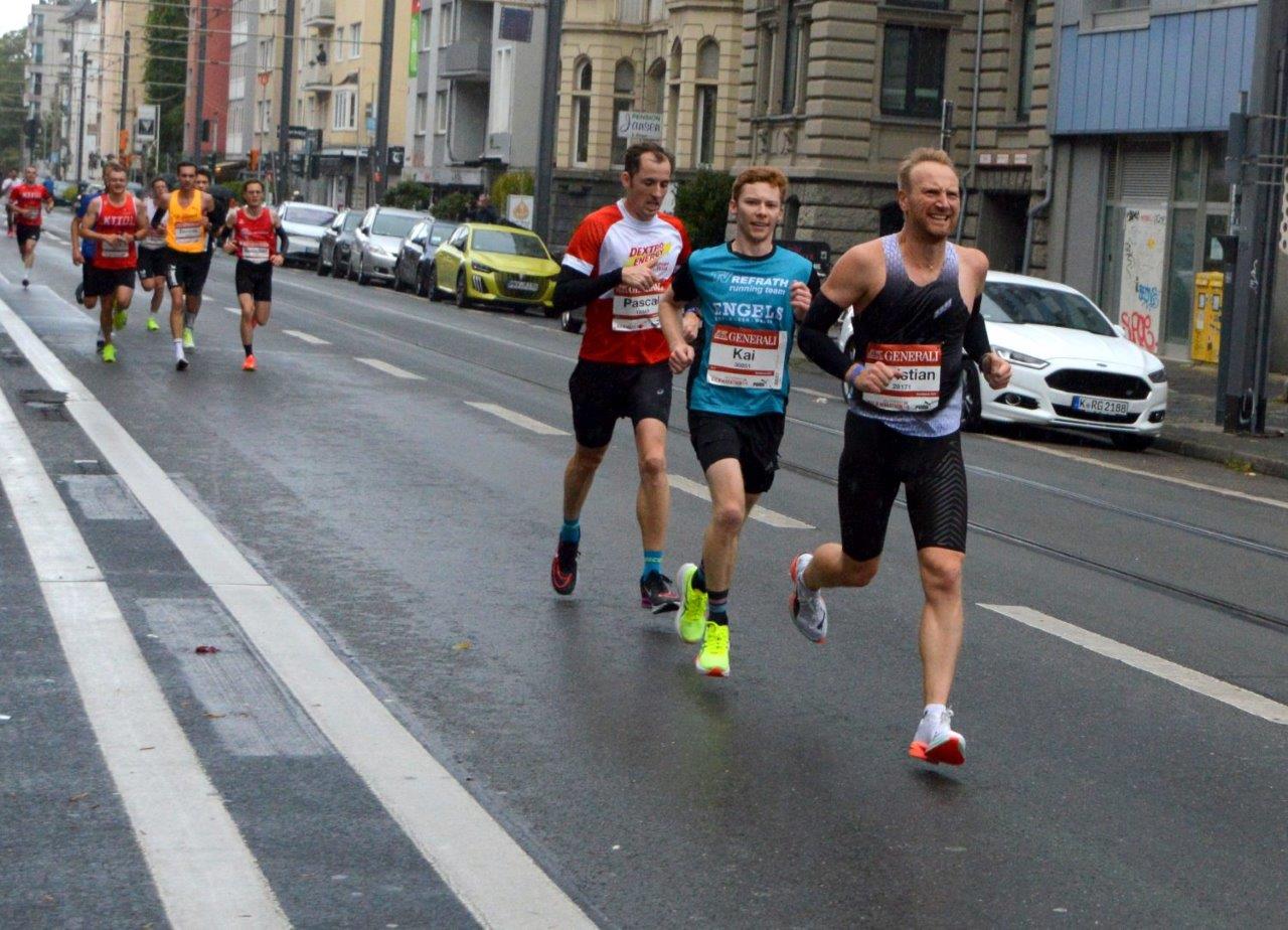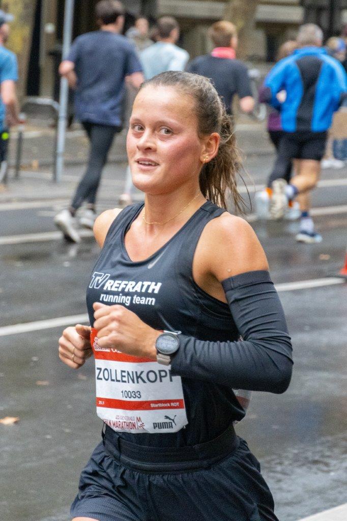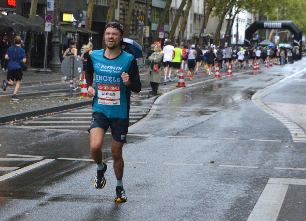 Über 18.000 Laufverrückte warteten bei regnerischem und windigem Wetter in Köln Deutz morgens früh um 8.30 Uhr auf den Startschuss. Vorne dabei und mittendrin standen elf ambitionierte Läuferinnen und Läufer vom TV Refrath running team. Im Elitefeld mischten vom ersten Meter an Lukas Kley, Cara Zollenkopf und Tobias Kratz vorne mit. Wichtig für alle war, eine gute Gruppe zu finden, damit man nicht zu viele Kilometer alleine im Wind steht. Das gelang auch recht gut, auch wenn die Männergruppe um Cara sie zeitweise nach vorne schickten, weil sie die Pace machen sollte. Unerhört … 😉 Nachdem das Training in den letzten Wochen sehr gut lief, hatte TVR-Laufcoach Jochen Baumhof keine Bedenken, dass die 27jährige mal etwas riskieren könnte. Mit einer 10 km Zwischenzeit von 34:28 min, war sie sehr forsch auf eine Endzeit von 1.13:40 std unterwegs. Doch sie merkte nicht, dass die Gruppe langsamer wurde. Mit einer fulminanten Endbeschleunigung auf dem roten Zielteppich am Kölner Dom wehrte sie auf den letzten Metern noch die Attacke der Deutschen Spitzenläuferin Hanna Klein (1:14:10) von der LAV Stadtwerke Tübingen ab. Cara Zollenkopf verbesserte als Gesamtzweite aller HM-Frauen ihre persönliche Bestzeit und ihren eigenen TVR-Vereinsrekord von 1:14:55 auf nun 1:14:05 std. Das war nach der Glanzleistung beim Düsseldorf Marathon im Frühjahr sicher ihr bestes Rennen bisher. Es siegte mit neuem Streckenrekord von 1:07:28 std Esther Pfeiffer in der drittschnellsten Zeit einer deutschen Läuferin. Schneller als Cara war an diesem Tag vom TVR nur Lukas Kley. Er erwischte einen absoluten Sahnetag - mit dem er selbst nicht gerechnet hatte. Taktisch geschickt lief der 33jährige in der ersten Verfolgergruppe mit. Nach einer kleinen Schwächephase nach rund 15 km packte ihn auf den Ringen der Kampfgeist und er überholte kurz vor Ziel noch den starken M45-Läufer Maciek Mierecko (1:08:09). Auch Lukas rannte als Neunter mit 1:08:03 std über eine Minute schneller als je zuvor.