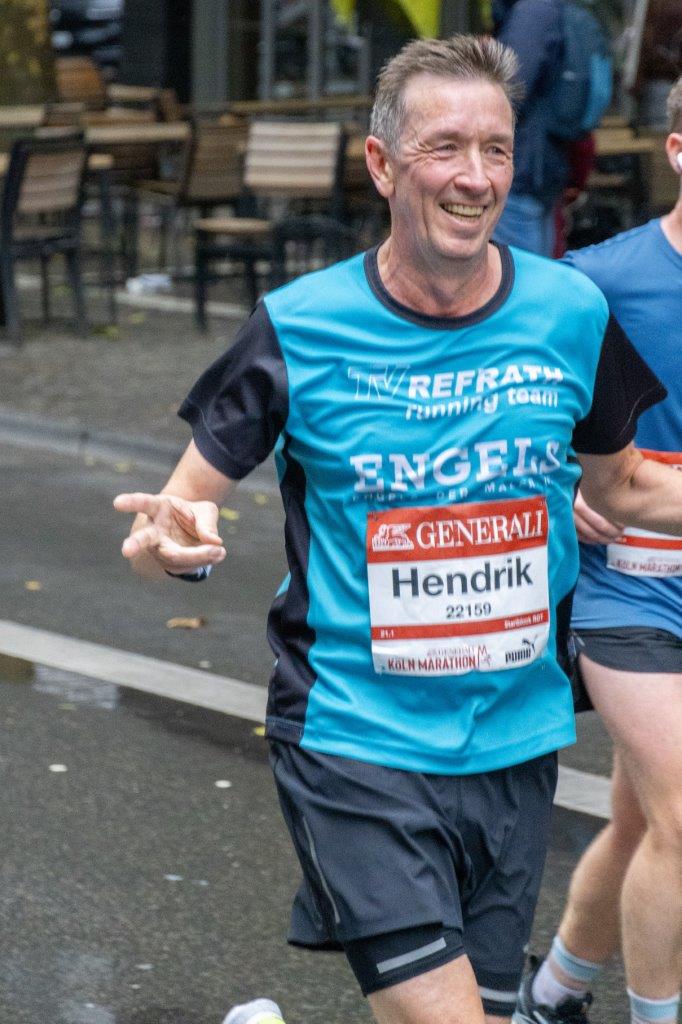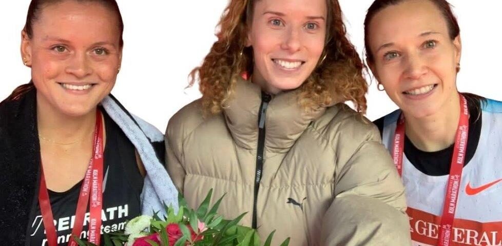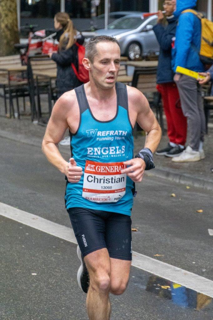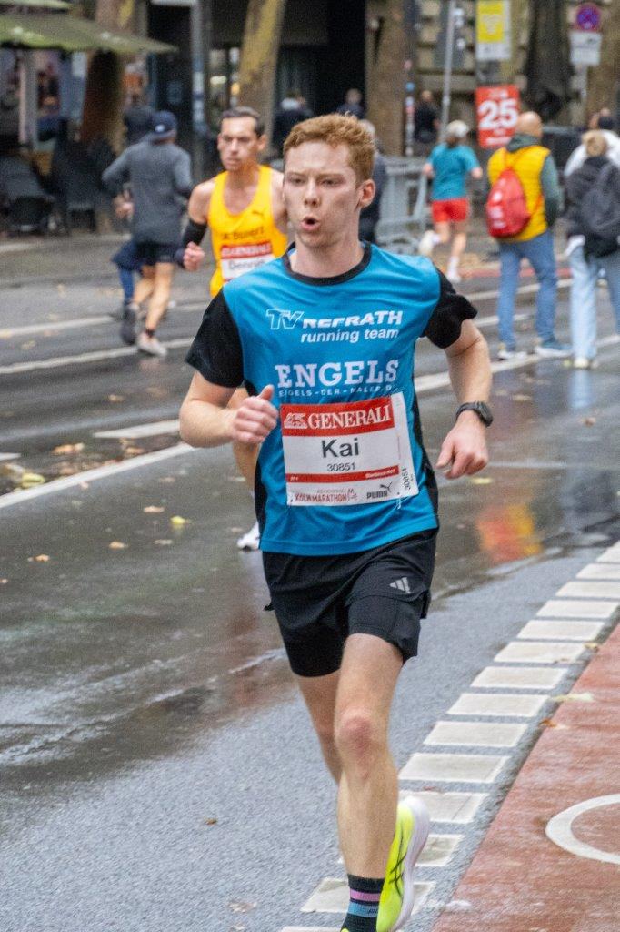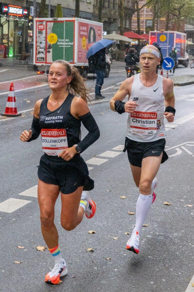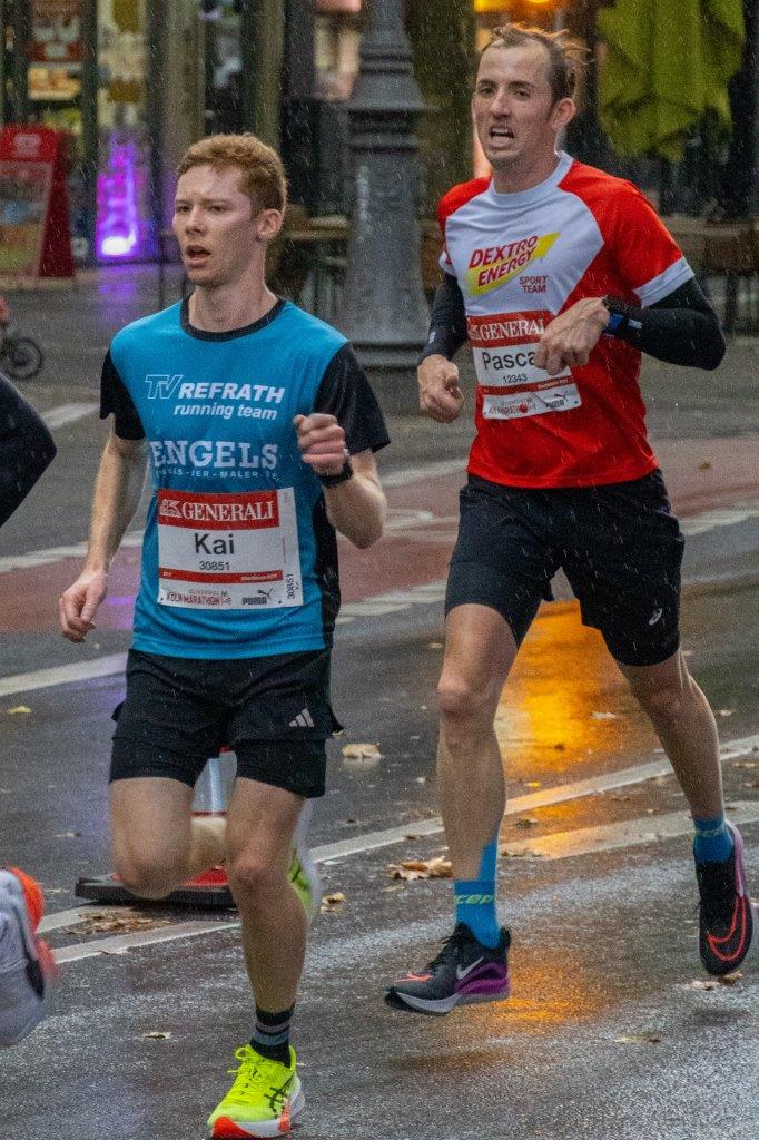 Über 18.000 Laufverrückte warteten bei regnerischem und windigem Wetter in Köln Deutz morgens früh um 8.30 Uhr auf den Startschuss. Vorne dabei und mittendrin standen elf ambitionierte Läuferinnen und Läufer vom TV Refrath running team. Im Elitefeld mischten vom ersten Meter an Lukas Kley, Cara Zollenkopf und Tobias Kratz vorne mit. Wichtig für alle war, eine gute Gruppe zu finden, damit man nicht zu viele Kilometer alleine im Wind steht. Das gelang auch recht gut, auch wenn die Männergruppe um Cara sie zeitweise nach vorne schickten, weil sie die Pace machen sollte. Unerhört … 😉 Nachdem das Training in den letzten Wochen sehr gut lief, hatte TVR-Laufcoach Jochen Baumhof keine Bedenken, dass die 27jährige mal etwas riskieren könnte. Mit einer 10 km Zwischenzeit von 34:28 min, war sie sehr forsch auf eine Endzeit von 1.13:40 std unterwegs. Doch sie merkte nicht, dass die Gruppe langsamer wurde. Mit einer fulminanten Endbeschleunigung auf dem roten Zielteppich am Kölner Dom wehrte sie auf den letzten Metern noch die Attacke der Deutschen Spitzenläuferin Hanna Klein (1:14:10) von der LAV Stadtwerke Tübingen ab. Cara Zollenkopf verbesserte als Gesamtzweite aller HM-Frauen ihre persönliche Bestzeit und ihren eigenen TVR-Vereinsrekord von 1:14:55 auf nun 1:14:05 std. Das war nach der Glanzleistung beim Düsseldorf Marathon im Frühjahr sicher ihr bestes Rennen bisher. Es siegte mit neuem Streckenrekord von 1:07:28 std Esther Pfeiffer in der drittschnellsten Zeit einer deutschen Läuferin. Schneller als Cara war an diesem Tag vom TVR nur Lukas Kley. Er erwischte einen absoluten Sahnetag - mit dem er selbst nicht gerechnet hatte. Taktisch geschickt lief der 33jährige in der ersten Verfolgergruppe mit. Nach einer kleinen Schwächephase nach rund 15 km packte ihn auf den Ringen der Kampfgeist und er überholte kurz vor Ziel noch den starken M45-Läufer Maciek Mierecko (1:08:09). Auch Lukas rannte als Neunter mit 1:08:03 std über eine Minute schneller als je zuvor.