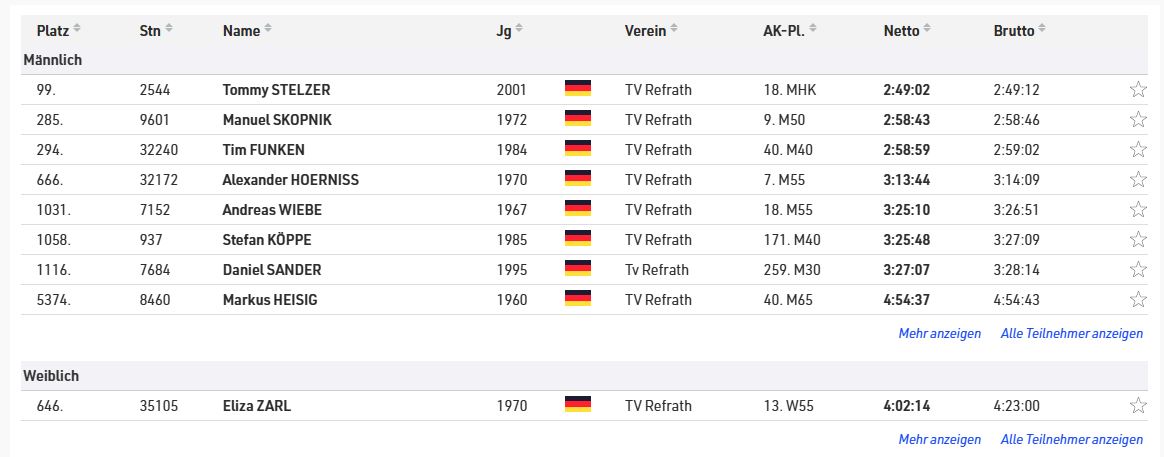 Über eine neue PB freute sich auch Stefan Köppe, der mit 3:25:48 std erstmals sub 3:30 std blieb. Manuel Skopnik und Tim Funken führten eine große Meute in ihrer Rolle als 3-Stunden-Pacer nach 2:58 std ins Ziel. Weiter TVR-Marathon-Finisher waren Alex Hörniss (7.M55/3:13:44), Andreas Wiebe (18.M55/3:25:10), Daniel Sander (M30/3:27:07), Markus Heisig (M65/4:54:37) und Eliza Zarl (13.W55/4:02:14), die ihren Sohn Christian bei seinem ersten Marathon begleitete.