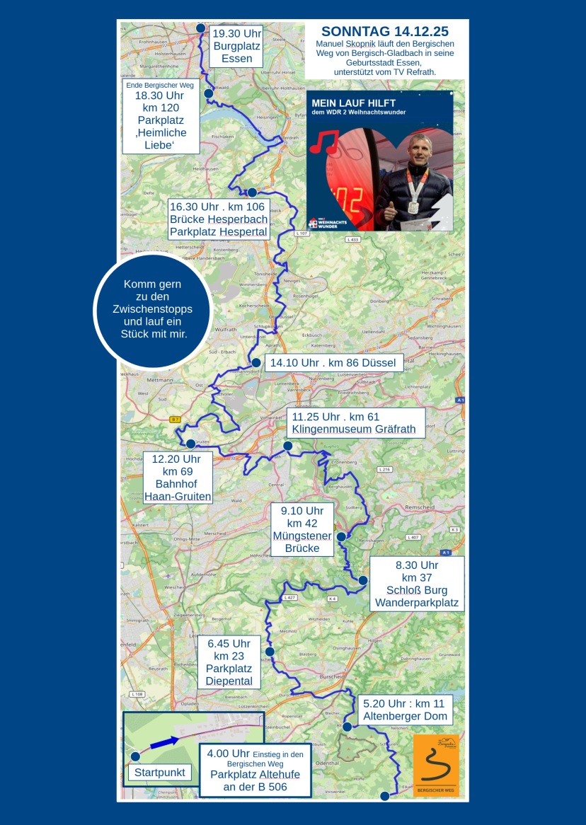 Unter dem Motto „Laufend Gutes tun“ unterstützt unser Ultramarathoni Manuel Skopnik mit einer eigenen Aktion das WDR2 Spendenprojekt „Weihnachtswunder“ im Dezember 2025.