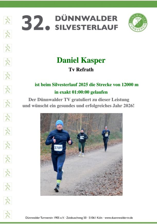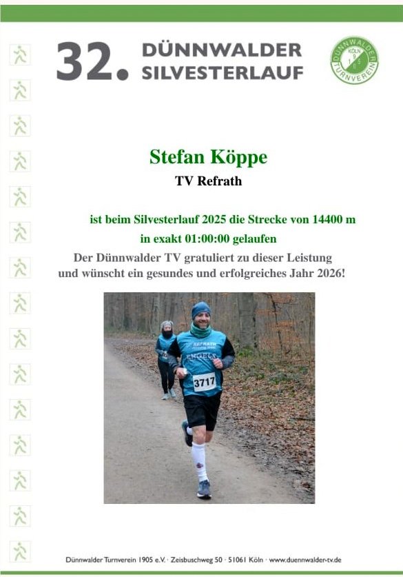 Beim 32. Dünnwalder Silvesterlauf liefen alle genau 60 Minuten. Die gelaufenen Kilometer wurden auf einer Urkunde dokumentiert. Vom TVR running team lief Stefan Köppe satte 14400 Meter und Daniel Kasper mit Daumen hoch genau 12000 Meter. Herzlichen Glückwunsch.