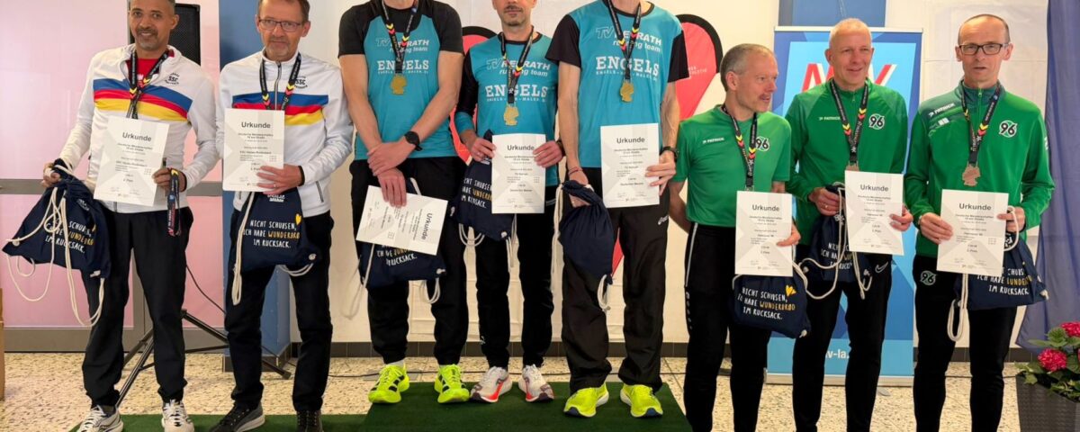 Die vierte Medaille und der zweite Deutsche Meistertitel sollten nicht lange auf sich warten lassen. Denn mit dem wichtigen dritten Mann im Bunde, Irek Meyer (8.M55/38:01) holten sich die Refrather wiederholt den DM-Titel in der AK M50-M60 … diesmal mit nur fünf Sekunden Vorsprung in 1:50:06 zu 1:50:11 Std vor den favorisierten Läufern der SCC Hanau-Rodenbach und Hannover 96 (1:53:57). Da zeigt es sich wieder einmal, dass es sich lohnt, etwas zu riskieren und bis zum letzten Meter zu kämpfen.