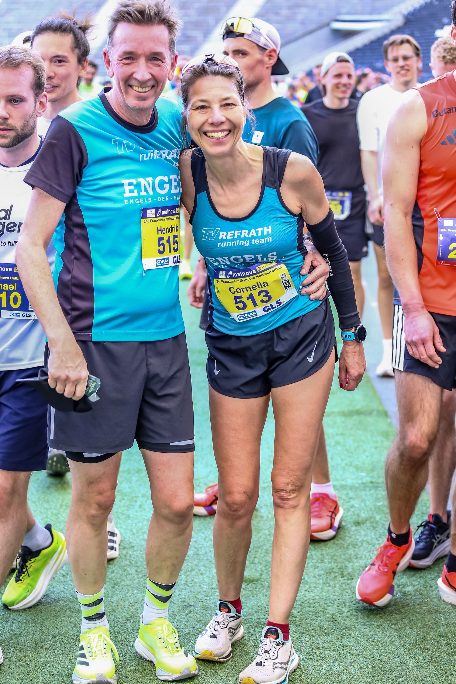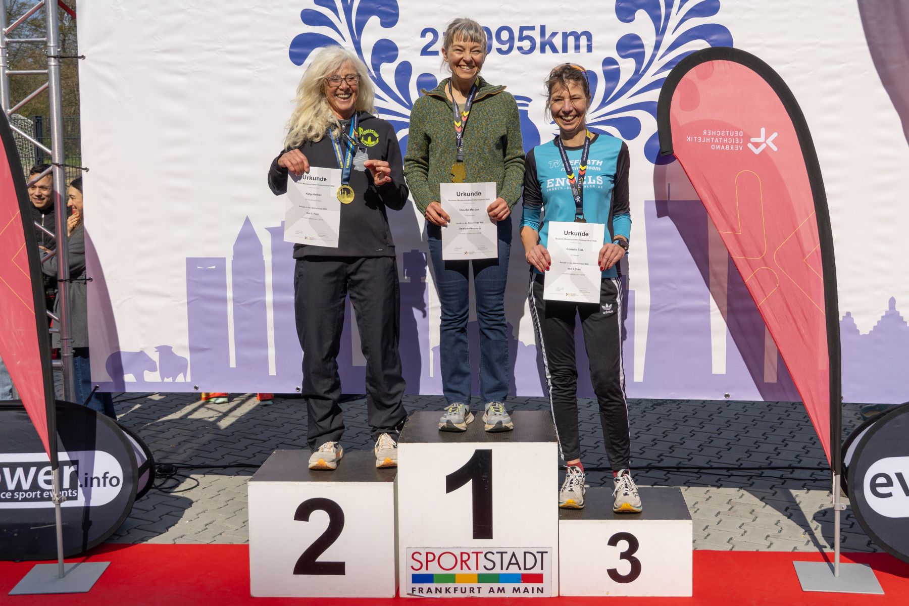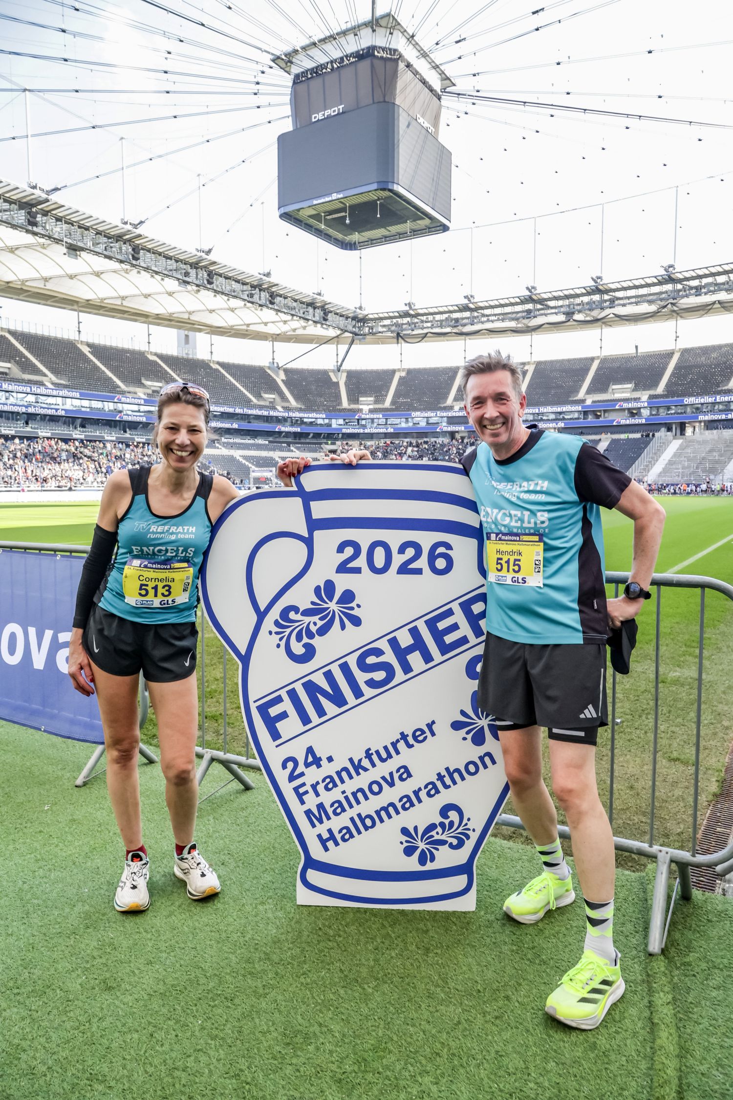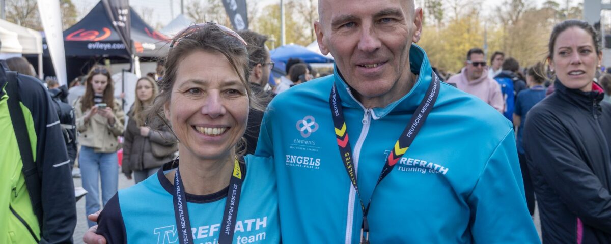 Gleich fünf aussichtsreich gemeldete Starter vom TV Refrath running team konnten wegen Krankheit oder Verletzung leider nicht starten. Das war vor allem für die ambitionierten Läuferinnen und auch für TVR-Lauftrainer Jochen Baumhof etwas bitter, bestand doch die realistische Chance, erstmals eine Mannschaftsmedaille in der Frauenwertung zu gewinnen. So blieb einzig Josefine Kratzer übrig, die mit einer perfekten Renneinteilung als 24. der W30 in 1:23:41 std eine neue Bestzeit lief. Ihn ihrem ersten Rennen ihrer neuen AK W60 lag Cornelia Türk lange auf Rang zwei. Doch auf den letzten fünf Kilometern machte sich ihr Trainingsrückstand bemerkbar. Nach 1:40:11 Stunden lief die Bensbergerin ins Bundesliga-Stadion der Eintracht Frankfurt ein und sicherte sich die verdiente Bronze-Medaille.